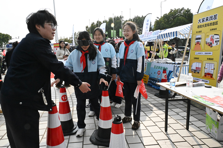 现场互动体验区人气高涨,扫码即可观看安全警示短片,参与交通知识问答赢取礼品;定向大喇叭、警用无人机、移动测速仪、交警机器人等科技装备集中亮相,民警现场演示其在交通管理、隐患排查中的应用成效。大型车盲区实景体验区域尤为热门,参与者直观感受风险,通过上车实景感受驾驶员视野盲区范围,强化“知危险、会避险”意识。