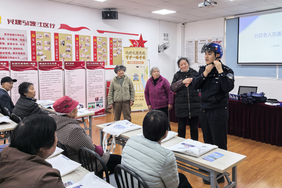 在辖区事故高发路口,交警对各类交通违法行为开展执法整治和宣传告知,有警保联动车定点停靠,循环播放典型事故警示视频与安全出行科普短片,以直观画面敲响安全警钟;在惠南镇新时代文明实践分中心内,居民自编自导的交通安全主题小品精彩上演,通过还原骑车逆行、路口抢行等常见场景,以寓教于乐的方式引导群众规避交通风险;在社区居委,交警深入剖析大型车转弯内轮差事故典型案例,针对老年群体讲解大型车安全风险防范知识点,并召集居村委干部和居民代表进行座谈,共同探讨交通事故防范行之有效的措施。